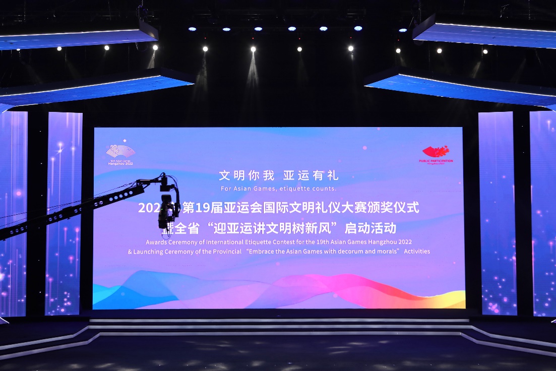9月4日下午,由杭州亚运会组委会主办,中国奥林匹克委员会支持,共青团浙江省委、浙江传媒学院、杭州市委宣传部(市文明办)承办的杭州亚运会国际文明礼仪大赛颁奖仪式暨全省“迎亚运讲文明树新风”启动活动在杭州举行。浙江省委宣传部副部长、文明办主任俞慧敏,亚组委副秘书长、杭州市委常委、宣传部部长戚哮虎,杭州市人大常委会副主任陈红英,亚组委副秘书长、杭州市副市长陈卫强,杭州市政协副主席周智林,亚组委副秘书长、办公室主任、杭州市政府副秘书长毛根洪,我校党委书记杨立平出席,杭州亚组委和省市有关单位负责人、我校播音主持艺术学院相关师生代表等参加了活动。