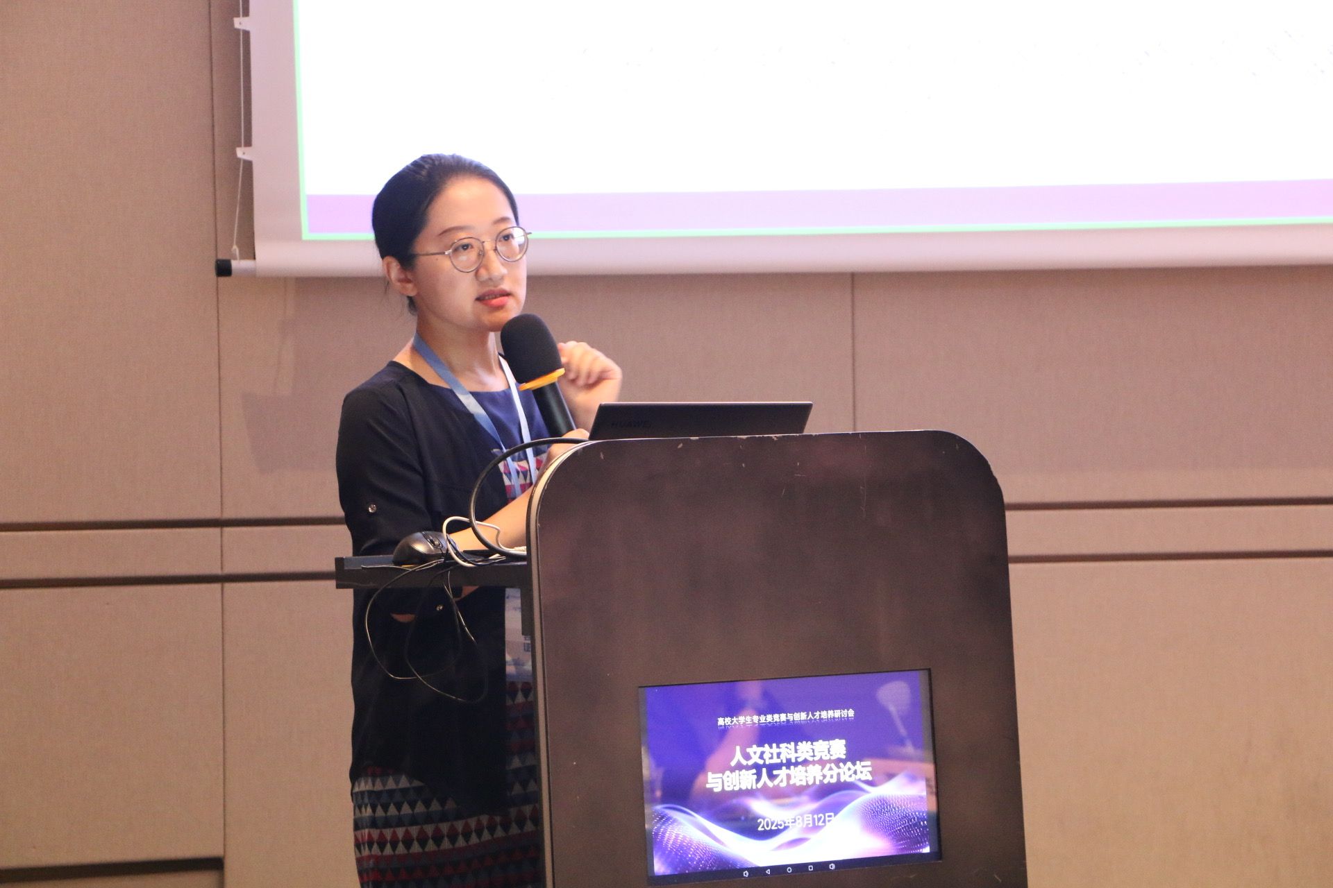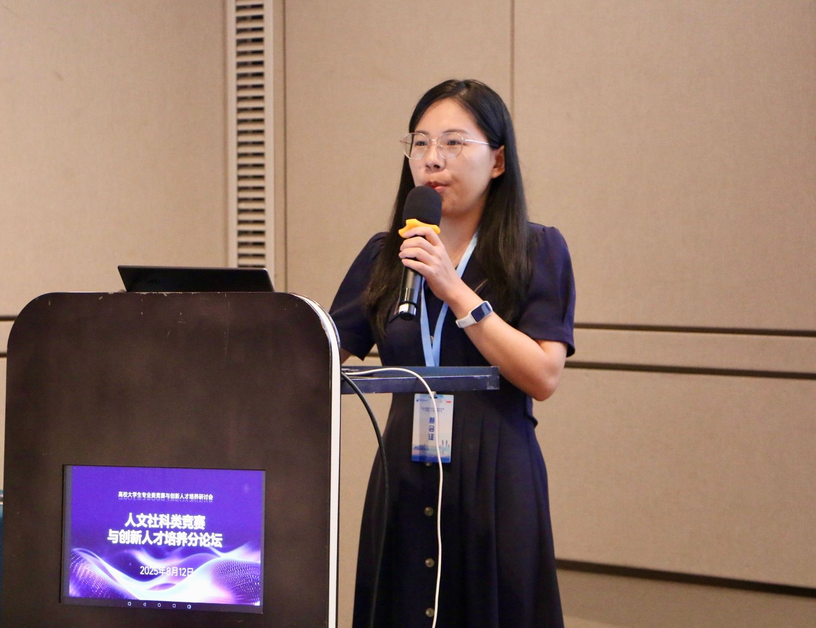 浙江工业大学徐巧宁副教授作《普通高校人文社科类竞赛发展概况》报告。她围绕专业概况、发展样貌、竞赛分析等三个方面详细讲解了竞赛质量测评、评价维度等内容,介绍了全国普通高校人文社科类竞赛的总体情况。