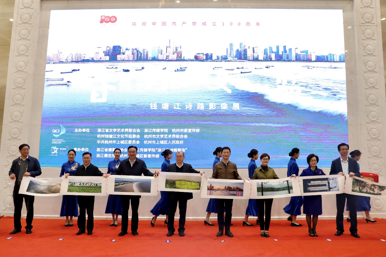 4月15日,庆祝中国共产党成立100周年暨钱塘江文化节之“春水如蓝——钱塘江诗路影像展”开幕式在浙江展览馆举行。