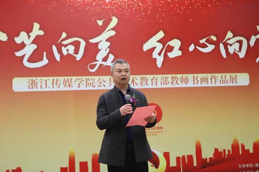 姚争在致辞中指出,本次画展既是我校今年美育工作的一件大事,也是我校党史学习教育的一个重要组成部分。本次展览展现了四位作者扎实的艺术功底、创新的艺术追求与真挚的爱党情怀。他希望以本次展览为契机,进一步搭建我校美育工作校地合作的平台,向社会输出更多、更好的艺术作品,为“文化浙江”建设乃至社会主义精神文明建设作出应有的贡献。