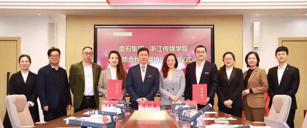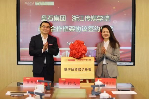 在热烈的掌声中,杨荣耀和王巧丹分别代表双方签署战略合作框架协议,并为浙江传媒学院·盘石集团数字经济教学基地揭牌。