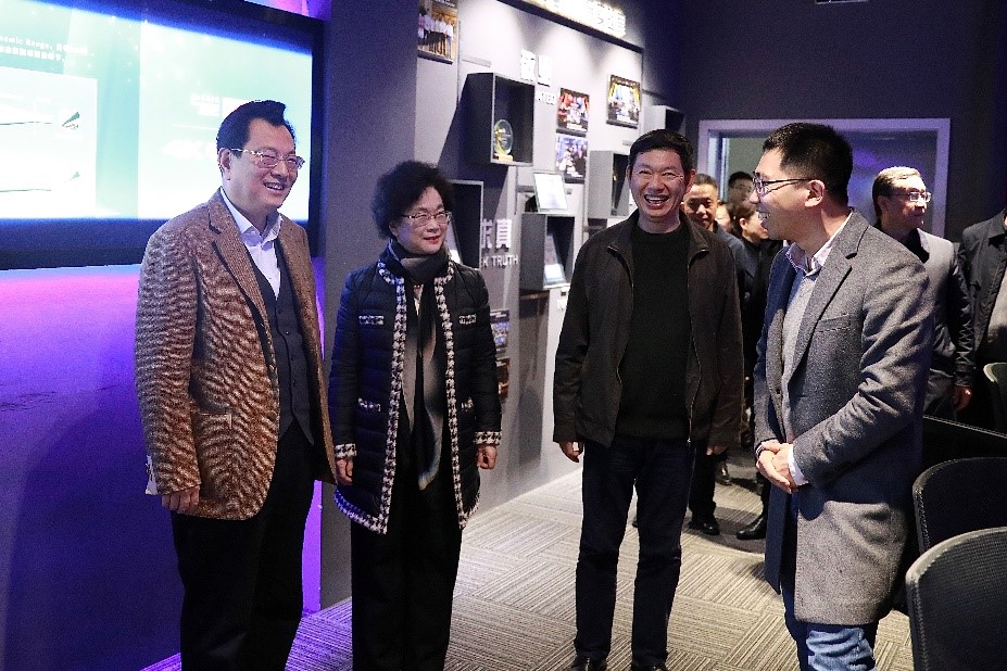 裘东耀一行在杨立平、徐小洲等的陪同下参观了我校校史陈列馆、4K电竞综合演播室与多媒体综合实验室,听取学校建设发展情况介绍。