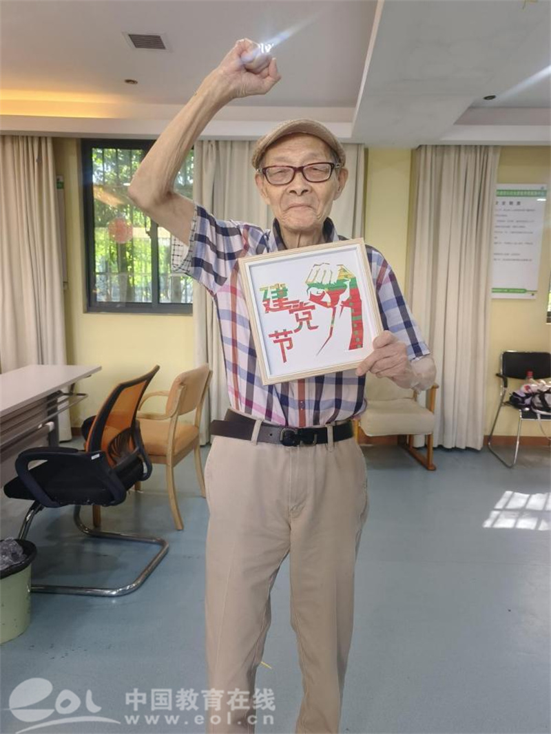 88岁老党员钱桂帮爷爷在志愿者的指导下,完成了一幅竹编画作品,满足自豪地向大家展示着自己的成果:“我要给你们敬个礼,很感谢你们带来的这场活动,我回去要把这幅画放在床边每天能够看到,今年是我入党的第六十六年!如今我们的党历经百年发展,已经非常成熟,希望我们的年轻党员要坚定党性,一辈子跟党走!”