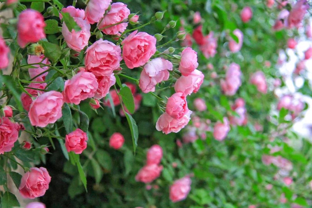校园甬道两旁,簇簇淡粉蔷薇相互依偎。