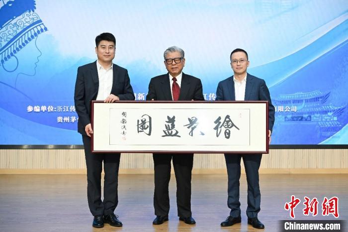 胡振民(中)向活动赠送《绘影“蓝”图》画册同名书法主题作品。 田雨昊摄