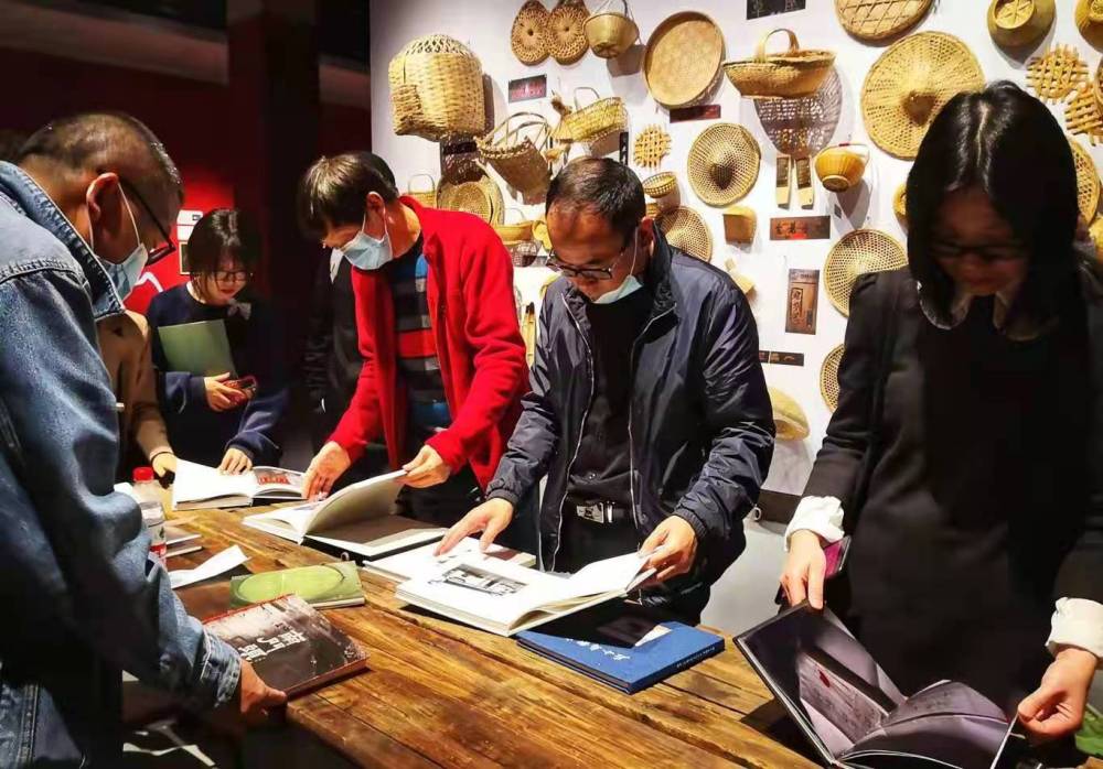 ↑4月15日,《钱塘江畔的美丽乡村》作者李雪富(左一)在介绍自己展出的作品。