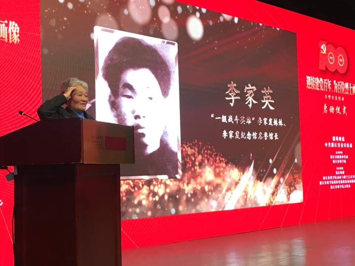 李家英,“一级战斗英雄”李家发妹妹上台分享英雄的故事。