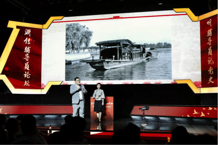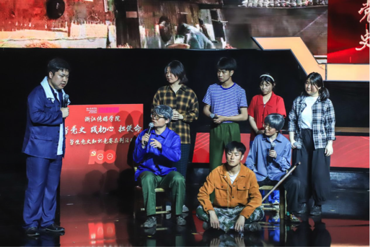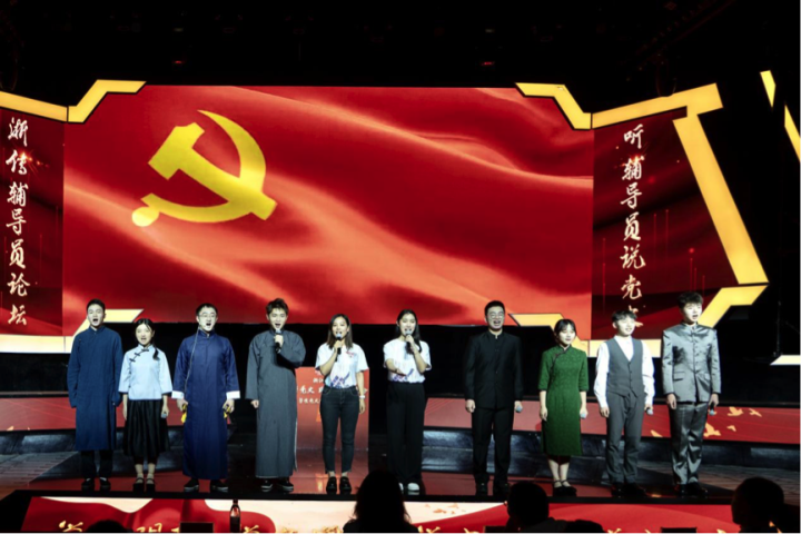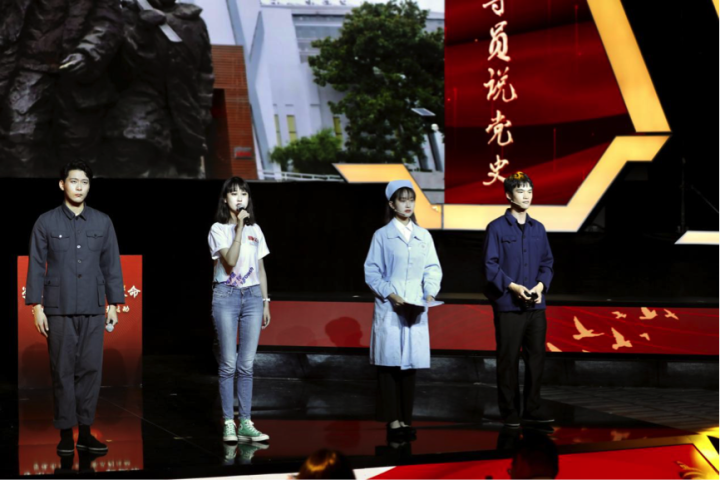 来自各学院9名辅导员和学生代表们从中国共产党成立至今的四个时期选取大家熟知的历史人物、历史事件、历史知识等,通过话剧、配音、情景再现等形式,从小小红船讲到巍巍巨轮,从“一大卫士”王会悟讲到“革命烈士”江姐,从无产阶级革命家方志敏讲到党的好干部焦裕禄,从党员之间的称呼讲到脱贫攻坚的伟业,沉浸式讲述让广大学子真切感受到了党的光辉历程和丰功伟绩。