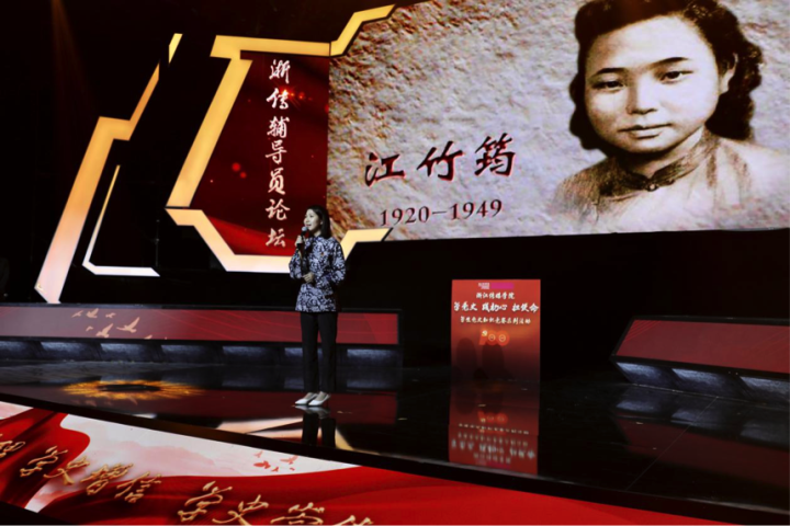 舞台上,浙江传媒学院媒体工程学院辅导员冯柳琴用铿锵有力的声音与同学们共同为《革命烈士江姐的英雄故事》电影片段配音,与在场师生共同追忆那段烽火岁月,感受江姐宁死不屈的革命精神与共产党人钢铁般的意志。
