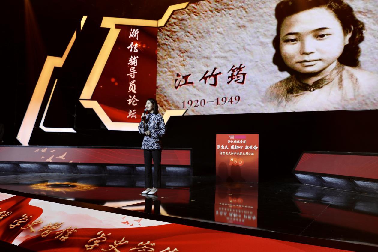 “钉吧!竹签子毕竟是竹子做的,共产党员的意志是钢铁!头可断,血可流,共产党员的意志,你是永远都打垮不了的!”舞台上,浙江传媒学院媒体工程学院辅导员冯柳琴用铿锵有力的声音与同学们共同为《革命烈士江姐的英雄故事》电影片段配音,与在场师生共同追忆那段烽火岁月,感受江姐宁死不屈的革命精神与共产党人钢铁般的意志。