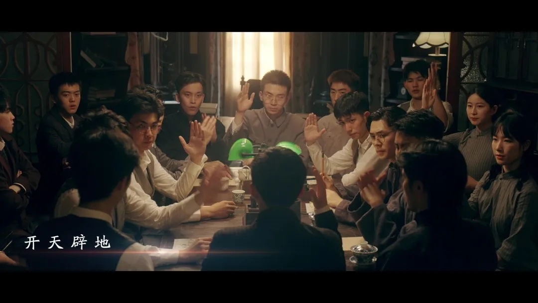 前奏及主歌:通过服化和影像局部还原当时的场景和人物,展现百年前的那群有志青年点燃梦想、扬帆起航!