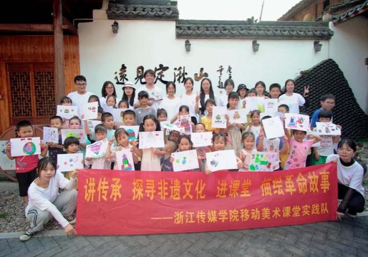 这次活动中,浙江传媒学院动画与数字艺术学院蒲公英美术课堂实践队的队员们,访革命老区、绘红色故事、寻非遗文化、润乡村童心,将青少年党史学习教育与美育教育相结合,以实际行动向党告白:青春有我,强国有我!