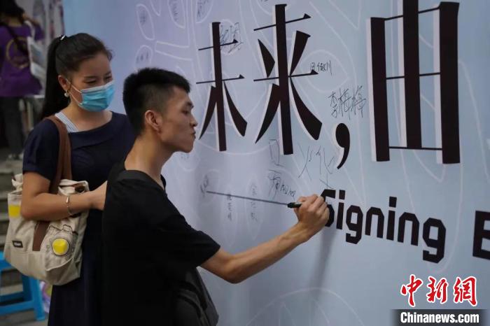展板上,吴烨写下自己的名字。 浙江传媒学院提供 “我想成为动漫游戏设计师”