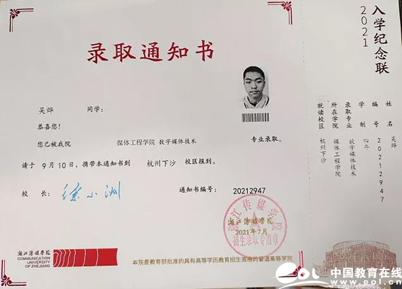 吴烨清楚地知道,只有比常人付出更多的努力,才能拥有更多的收获。终于,所有的努力都没有被辜负。2021年6月24日,吴烨与父母怀着紧张忐忑的心情围坐在电脑前查询自己的高考分数——494分,超过贵州省一本线38分,这一刻足以让一家人热泪盈眶。“拿到录取通知书的一刻,我真切地体会了一把梦想成真的感觉”吴烨激动地说道。