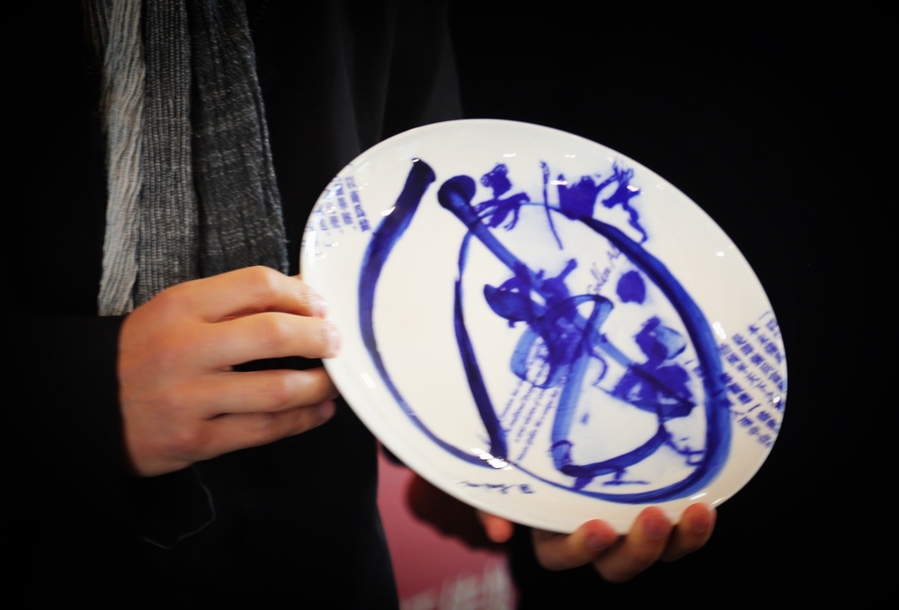↑杨超介绍“国”字书法青花瓷赏盘。