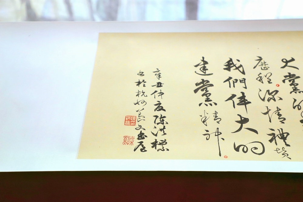 黄亚洲在书卷前细细观看,不时点评一二:“最难能可贵的是,长卷中运用了楷书、行书和草书等各种字体,融会贯通,一气呵成,毫不违和。在字形、疏密和篇章方面也非常和谐。陈洪标的两幅百米长卷很有特色,很见气势。”