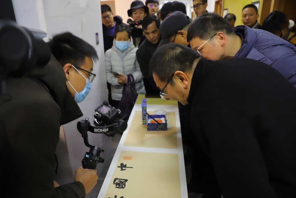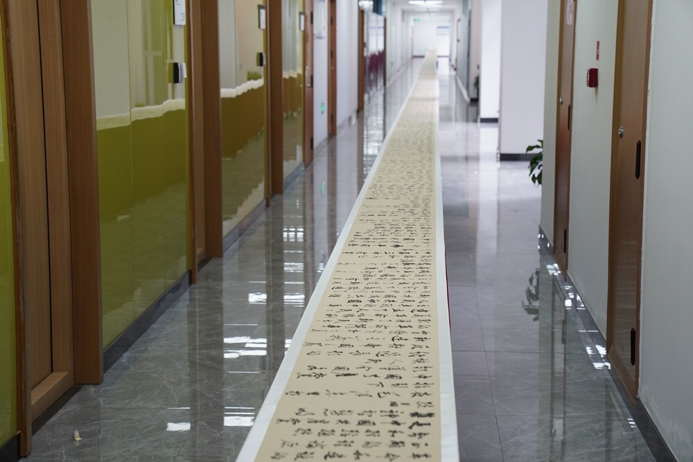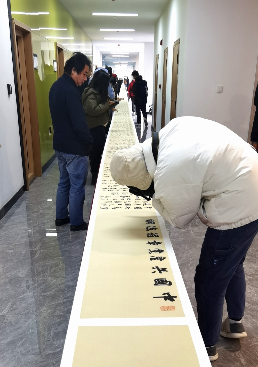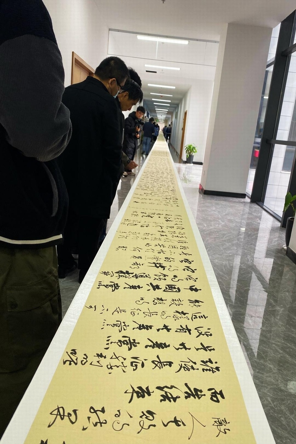 今年5月28日,第一幅百米长卷《抄写<中国共产党章程>总纲》在浙江传媒学院桐乡校区举行的“快闪式”预展中,师生反响强烈,先后得到学习强国、新华社和光明网等30多家中央和省市主流媒体的报道。