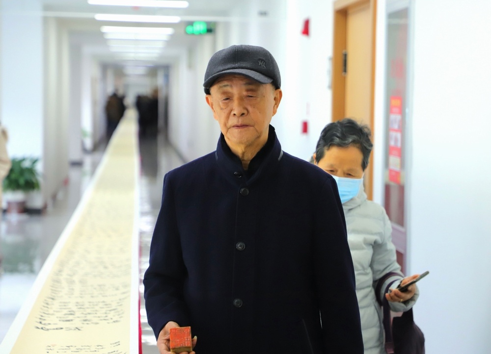 ↑袁道厚先生在称赞百米长卷书写的不易。王志岳 摄