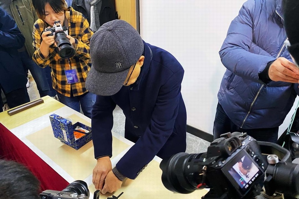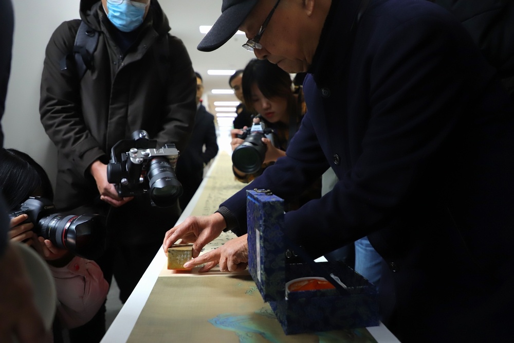 ↑见证西泠印社名家袁道厚先生现场为百米长卷钤印。