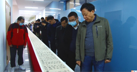 这次展出的两幅百米长卷,也是从学党史中而来,是《浙江传媒学院报》副主编陈洪标通过抄写党章总纲和节录党史教育读本中的内容,把2万多字写成了两幅书法长卷。大家对气势恢宏、蔚为大观的两幅长卷赞叹不已。
