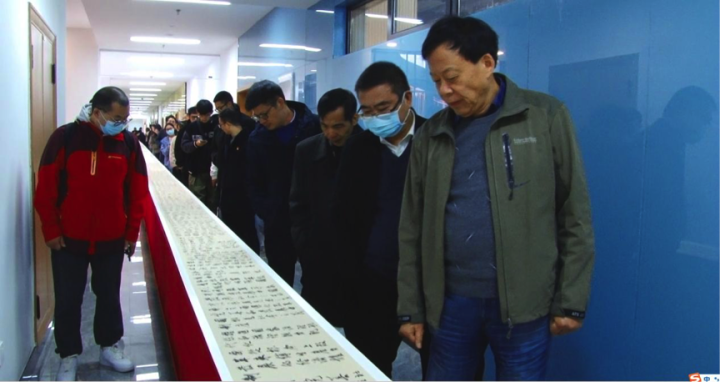 这次展出的两幅百米长卷,也是从学党史中而来,是《浙江传媒学院报》副主编陈洪标通过抄写党章总纲和节录党史学习教育读本中的内容,把2万多字写成了两幅书法长卷。大家对气势恢宏、蔚为大观的两幅长卷赞叹不已。