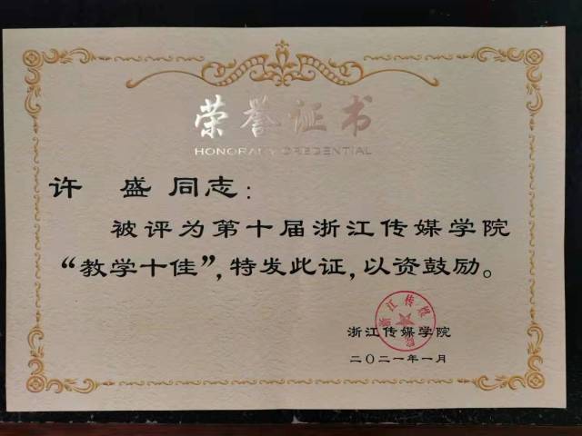 今年1月,许盛还被评为浙江传媒学院第十届“教学十佳”。