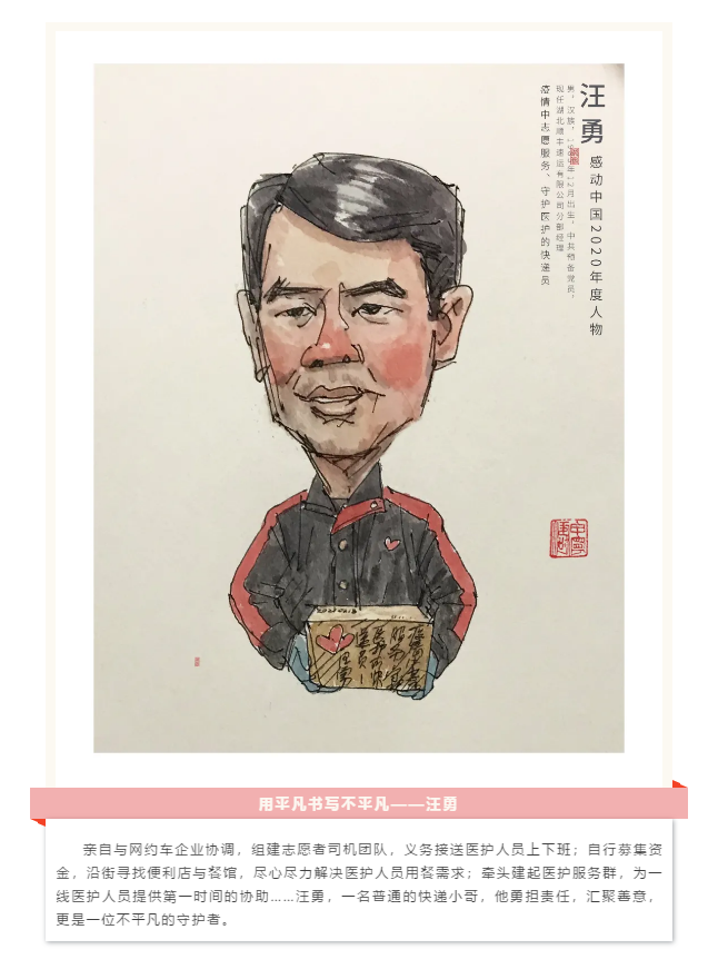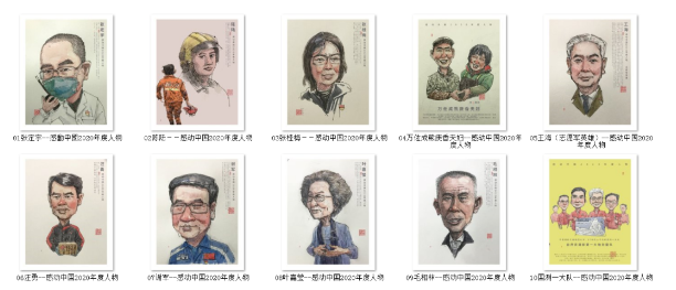 申宁涛创作的“感动中国2020年度人物”系列漫画鲜明地展现了英雄人物的形象。他表示,在创作过程中首先要设计整个人物的形象,接着再了解其相关的职业背景,然后观察人物体态体貌特征,使其形象更突出。“比如在画快递小哥汪勇的漫画时,我就把他快递的服装以及他搬快递的姿势都表现出来了,借助这些人物特征可以让受众对于人物的职业有一个直观的定位。”