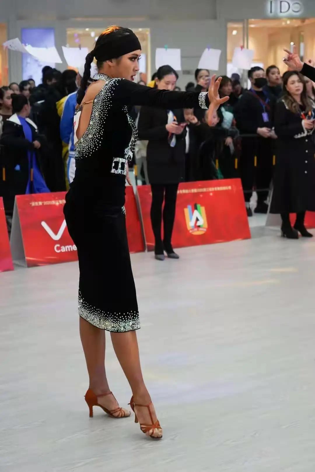 桂茹云稳住呼吸,脚下卯足劲,努力控制住自己的平衡,跟着恰恰的音乐,在舞池中摇曳,尽管有几次险些摔倒,但没有影响到整个人的竞赛状态。水钻在墨色舞裙的衬托下闪闪发光,最终流畅地完成了每一支舞。