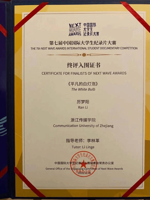第七届中国国际大学生纪录片大赛入围终评影片名单出炉,2016级广播电视学厉梦阳的作品《平凡的白灯泡》名列其中。