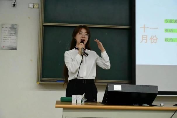 数字媒体与智能传播研1班的刘汀芷第一个上台分享,她分享的内容主要分为两部分,一个是考研时期的时间规划,另一个是考研的心态调整。