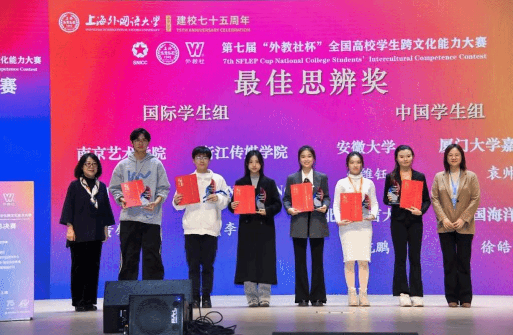 第七届“外教社杯”全国高校学生跨文化能力大赛由中国教育国际交流协会指导,上海外国语大学主办,吸引了来自28个省市自治区1000多所高校的3000多名学生参加。决赛中,20支国际学生队伍展开角逐,展现出强劲的跨文化交际能力及对中国文化的理解。而我校留学生表现尤为亮眼,他们以马来西亚“峇峇娘惹”的前世今生为选题,探讨文化的冲突、融合与坚守,凭借出色讲解与独到见解,在比赛中脱颖而出,充分展现了卓越的跨文化交流能力,给评委与观众留下深刻印象,成为全场焦点,尽显我校学子风采与实力。