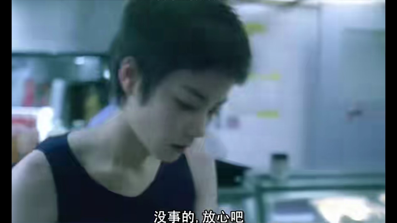 在镜头语言上也有针对这方面的巧妙设计,比如下图,明明是633在跟老板谈话,镜头的主体却是阿菲在拖地,想要展现的就是阿菲正在听633的话,十分在意633的这种心理。这种展现人物心理的方式值得学习。