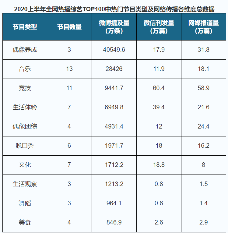 据统计,2020年上半年讨论度最高的三个综艺类型分别是偶像养成类、音乐类以及竞技类。面对市场的筛选,它们能从其中脱颖而出必然是存在其道理的。从中进行分析,便能得知观众的喜好和倾向,从而获知市场的风向。