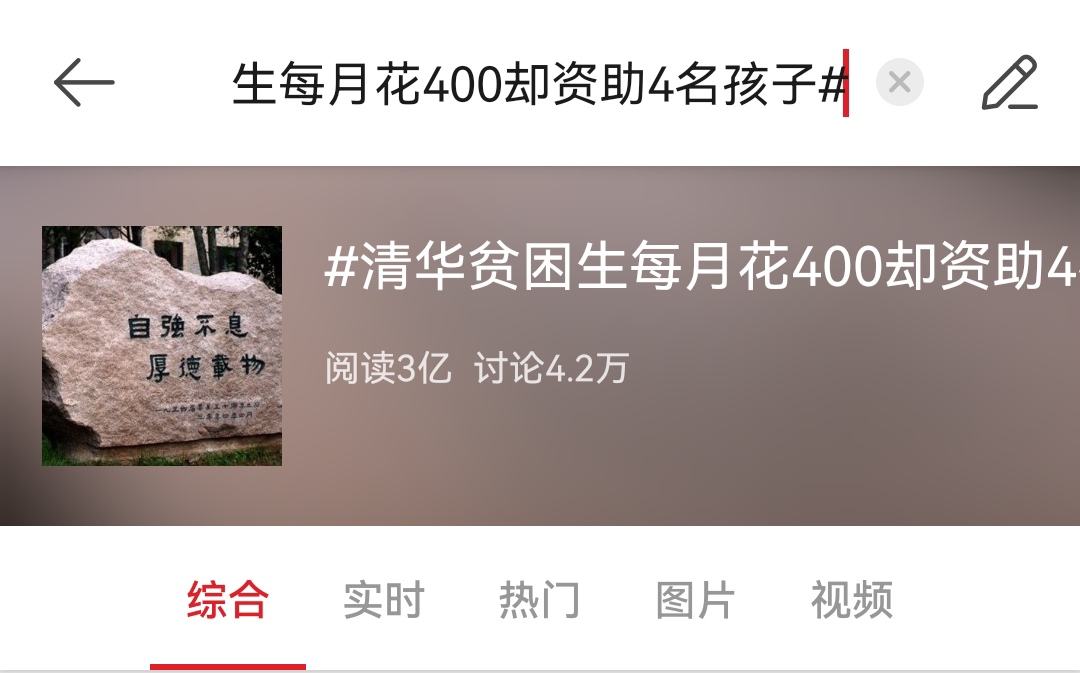 11月9日,一则“清华贫困生每月花400却资助4名孩子”的话题冲上热搜,内容为一名清华毕业生发布于“树洞”的“贫困生自述”。在大学生平均生活费达到2500元的北京,他每月仅留四百元作为生活费,每学期省出3200元用于资助家乡希望小学的四个孩子。他在帖子里反复提及、感谢帮助过他的老师、同学和资助人,也希望自己哪怕只照亮一个人也好。