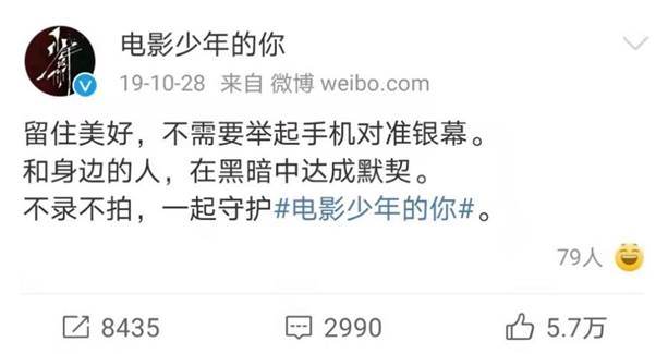 反对影院屏摄需要倡议,更需要实际行动。不仅仅是影院自身的管理力度需要加大,对于拒绝屏摄需要进行一定程度地劝导或处罚。对于观众而言,分享电影的方式有很多种,拍摄票根成为大多数人的选择,并且大部分影院会在公共领域为观众留出与海报或明星肖像的合影位置,满足观众的拍摄与分享愿望。或许,写一篇生动的影评,用文字表达自己的电影的喜爱和想法比九宫格的屏摄照片更加打动人心。