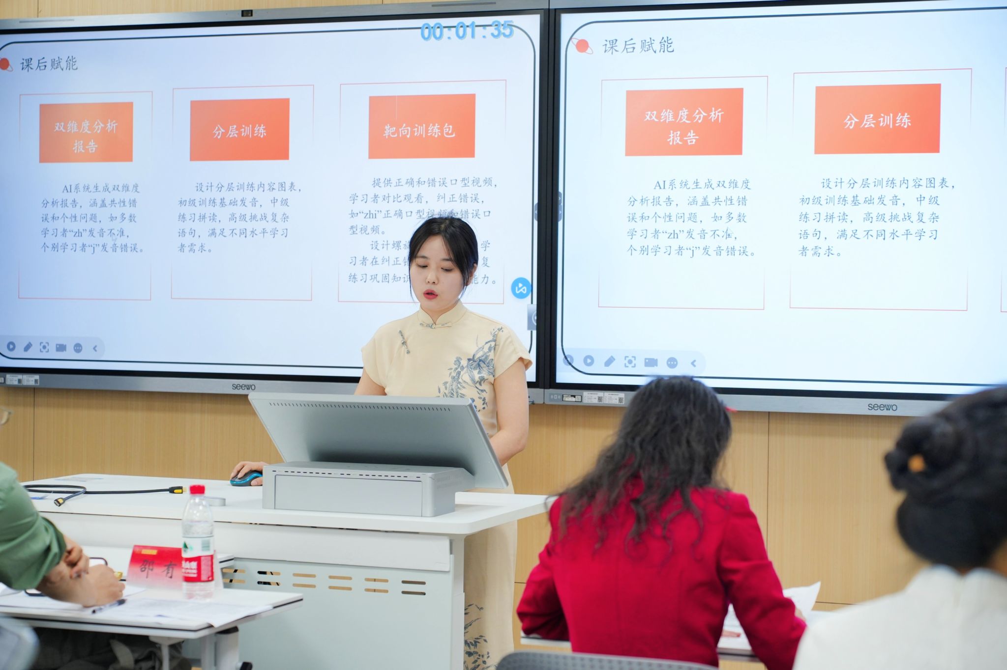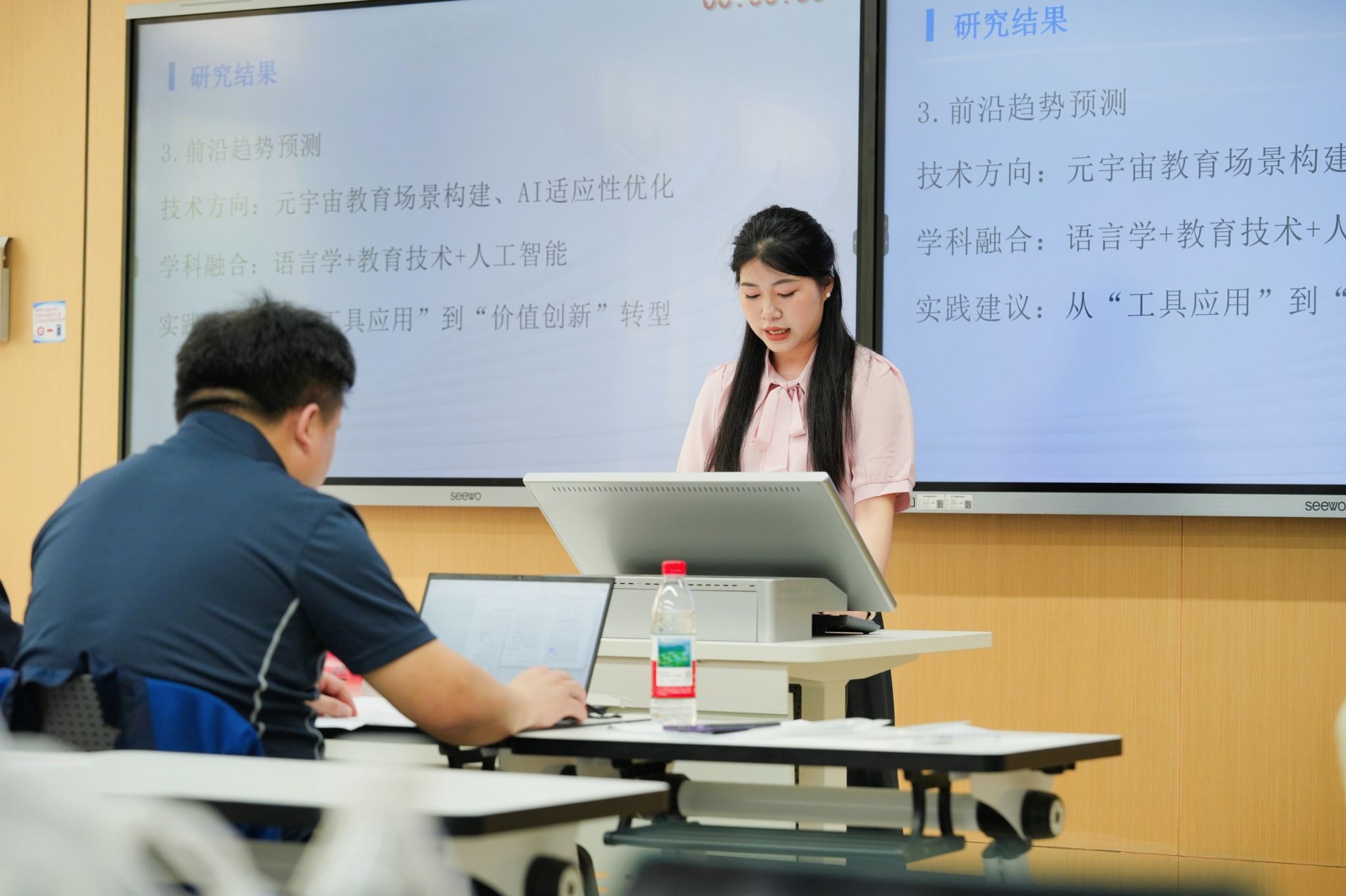 上午的研究生论坛设五个分论坛,111位青年学子就“AI+教学资源开发”“大语言模型应用”等前沿议题汇报交流。华东师范大学丁安琪教授等专家担任主持并点评。研讨聚焦DeepSeek、ChatGPT等生成式AI工具应用,约20%论文涉及语法纠错、文化传播等场景实证探索。如林舒心团队证实生成式AI模型可提升汉语二语初学者听说能力;黄宏韬团队研究虚拟数字人辅助中高级汉语教学;蔡汶池对比ChatGPT与文心一言揭示文化意象传递边界;彭雪媛呈现个性化学习研究范式转向等,研究覆盖语音纠偏到商务汉语案例构建等多元场景。