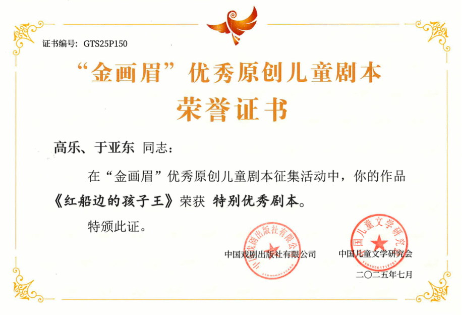 在刚刚落幕的2025年“金画眉”优秀原创儿童剧本荣誉颁发盛典上,华策电影学院教师高乐、于亚东的原创儿童剧《红船边的孩子王》荣获特别优秀儿童剧本奖。