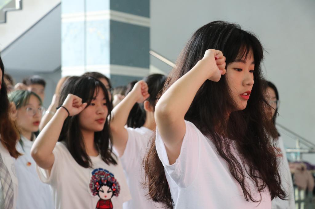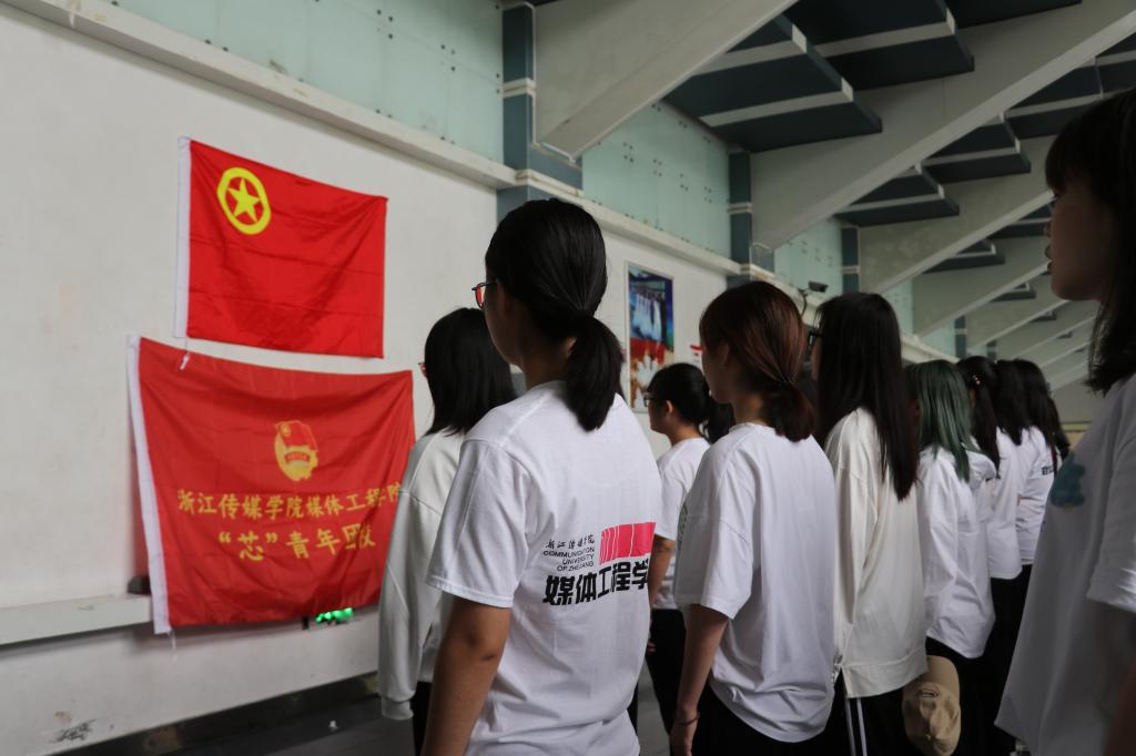 媒体工程学院团员代表在体育馆集合,重温入团誓词。团员们高举右手,紧握右拳,再次郑重宣誓、唱响团歌。