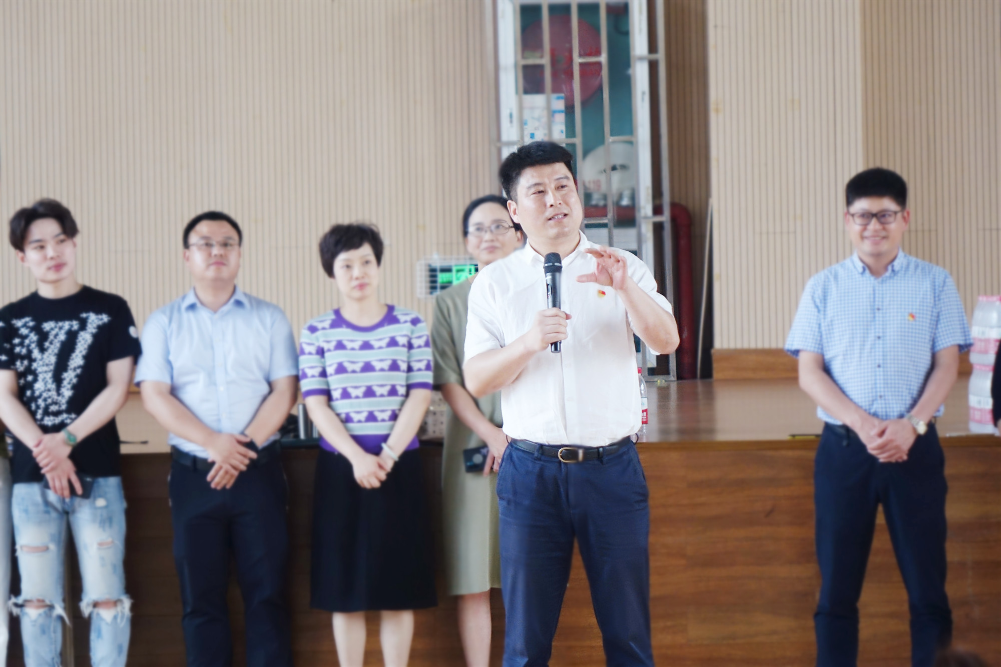 为庆祝中国共产党成立100周年,5月31日下午,由浙江省委宣传部牵头,华策电影学院、音乐学院师生参与的大型献礼建党百年系列节目在桐乡校区体育馆进行联排。校党委委员、宣传部部长、统战部部长陈永斌一行来到排练现场看望慰问排练剧组。华策电影学院、音乐学院相关负责人,指导老师等一同来到现场。