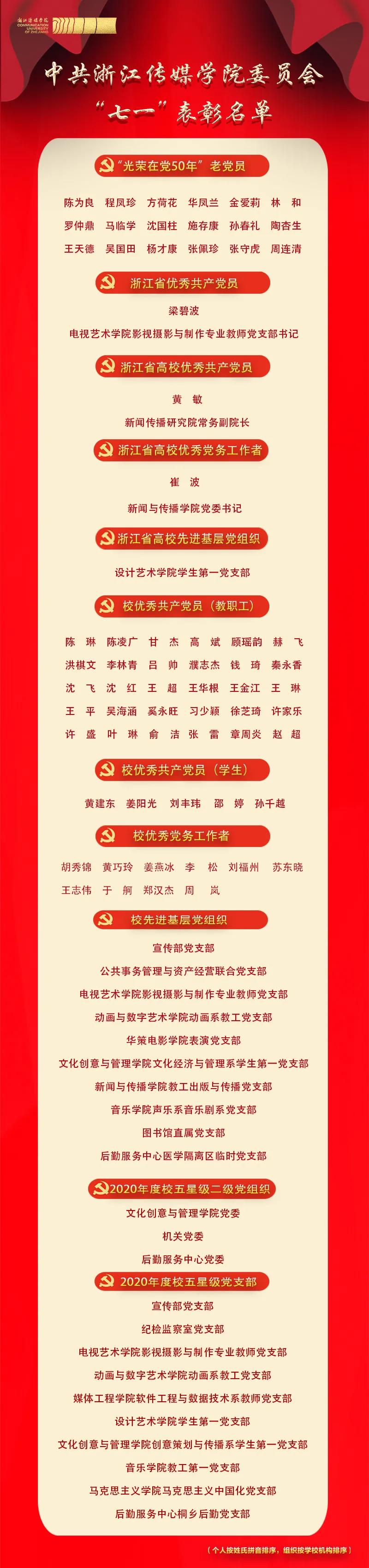 徐小洲宣读“七一”表彰名单,他希望受到表彰的先进集体和优秀个人,珍惜荣誉,再接再厉,以更加饱满的精神、更加昂扬的斗志,助力学校高水平传媒大学的建设。全校各级党组织和广大党员干部要向受表彰的先进集体和优秀个人学习,积极投身共同富裕示范区建设,以优异的成绩向建党100周年献礼!