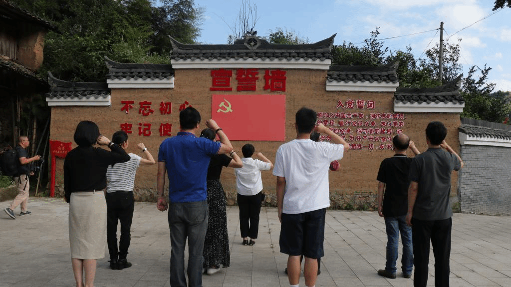 全体党员在严山村的宣誓墙前重温入党誓词并参观红军居住旧址,近距离感受浙西南革命精神在这里留下的丰富革命遗存和精神财富。