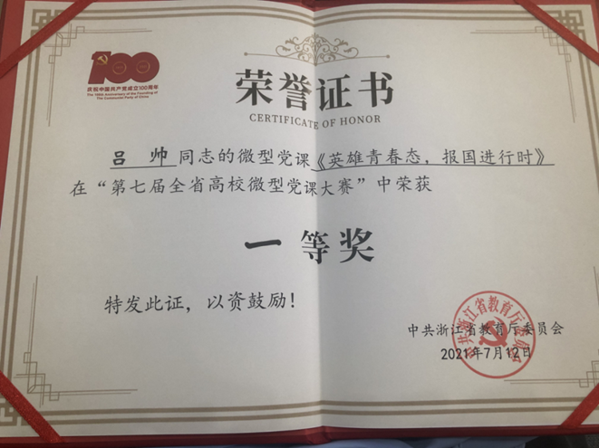 7月12日,2021年全省高校青年理论宣讲大赛暨第七届全省高校微型党课大赛决赛在浙江工业大学举行,我校党员教师吕帅在比赛中发挥出色,以声情并茂的演讲、富有感染力的表现喜获大赛一等奖。