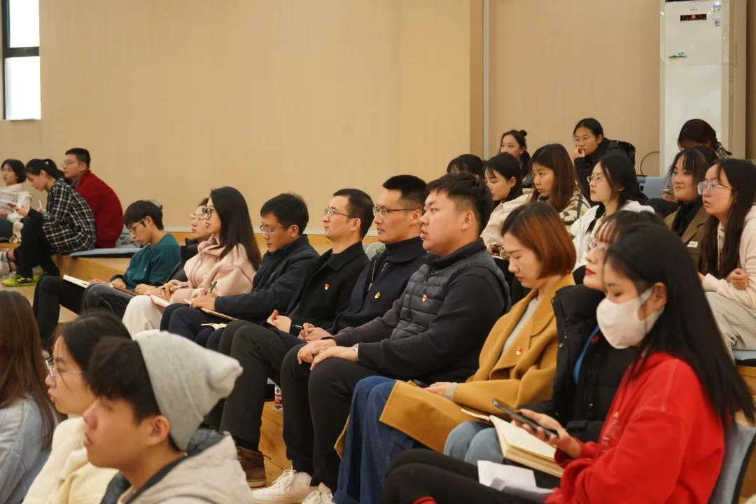 学院党委书记林利宏、院长张雷、党委副书记李松出席。各党支部书记、学院党员发展对象60余人围坐一起,认真聆听了宣讲。