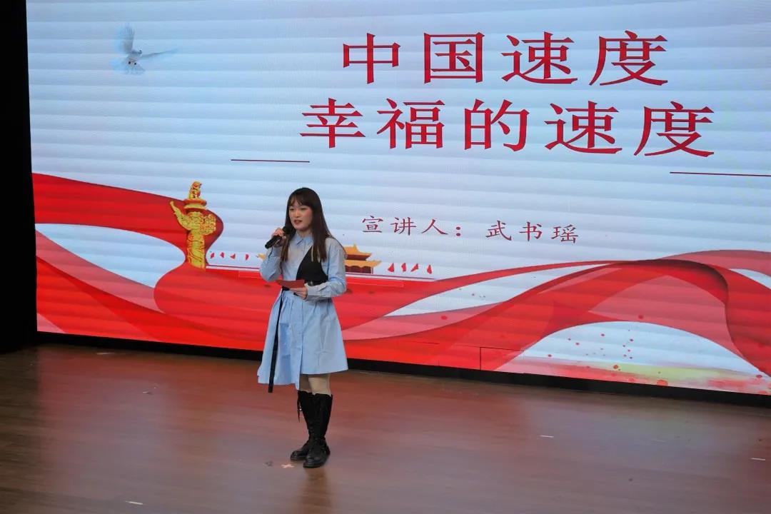 20文产2班武书瑶向大家讲述了自己的家乡——山西吕梁,以及当地的人民对交通时间日新月异的变化的深切体会,祖孙三代实现了从“3天—到7小时—再到3小时”的提速,这不仅彰显了中国速度和中国实力,更是社会发展、科技进步、人民幸福的体现。