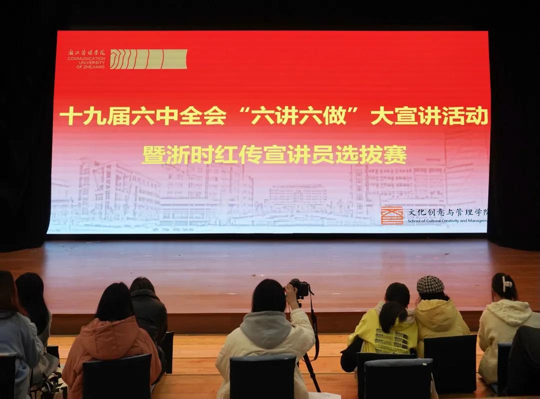 学院党委迅速响应号召,立足学院师生思想实际、把握青年大学生这一宣讲对象主体,精心组织、充分发动,结合学院党建品牌——“浙时红传”新时代大学生理论学习实践团的建设,于12月7日在学院创意盒子举行了党的十九届六中全会精神“六讲六做”大宣讲活动暨“浙时红传”理论宣讲员选拔赛。