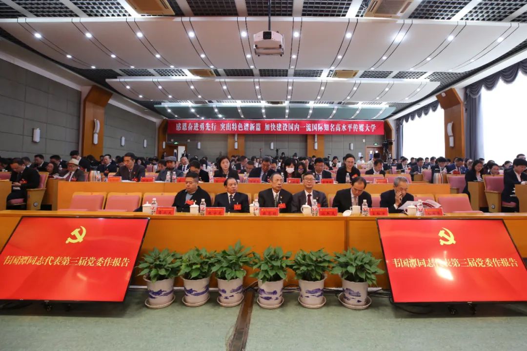 韦国潭指出,学校第三次党代会以来的五年极不平凡,在省委、省政府坚强领导下,在国家广电总局的亲切关怀下,在省委教育工委、省教育厅的直接指导下,学校党委团结带领全校党员和师生员工,办成了许多事关长远的大事要事,取得了一系列标志性成果,学校成功获批硕士学位授予单位及3个硕士学位授权点,实现了跨越式发展。五年来,学校坚持以政治建设为统领,党对学校的领导全面加强;落实立德树人根本任务,高素质传媒人才培养成效明显;全面推进人才强校,人才队伍结构发生历史性变化;牢固树立学科龙头地位,科研创作水平跃上新台阶;积极融入和服务国家战略,社会合作格局有效拓展;大力推进教育对外开放,国际化办学迈出新步伐;全面深化综合改革,高质量办学内生动力不断释放;全力建设幸福浙传,综合服务保障能力持续增强,为新时代学校事业快速发展奠定了坚实基础。