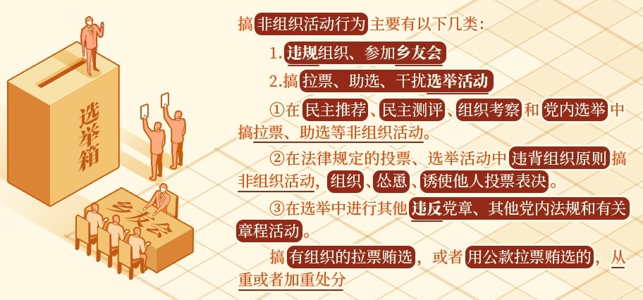 《中国共产党纪律处分条例》第八十二条、第八十三条对搞非组织活动行为列出负面清单,对违规组织、参加乡友会,以及搞拉票、助选、干扰选举活动作出处分规定。