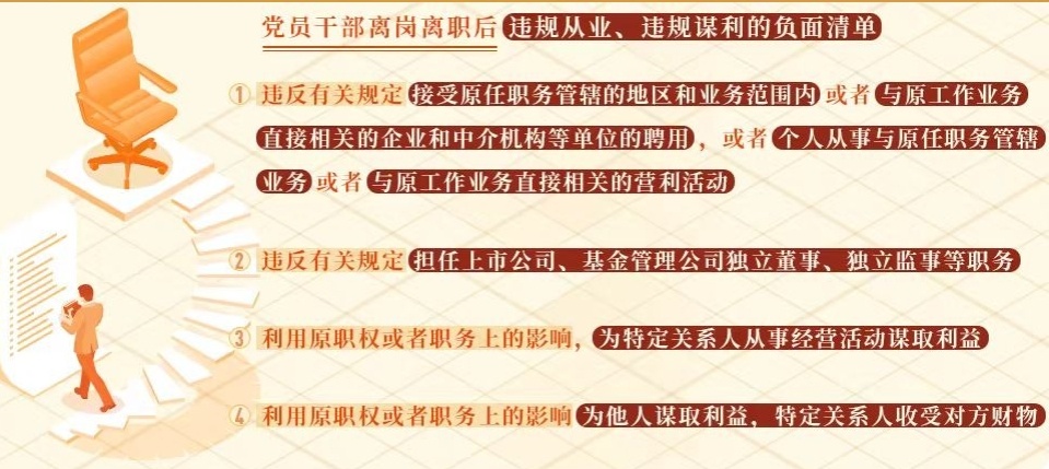 第一百零五条规定,党员干部离职或者退(离)休后违反有关规定接受原任职务管辖的地区和业务范围内或者与原工作业务直接相关的企业和中介机构等单位的聘用,或者个人从事与原任职务管辖业务或者与原工作业务直接相关的营利活动的,给予相应处分;党员领导干部离职或者退(离)休后违反有关规定担任上市公司、基金管理公司独立董事、独立监事等职务的,给予相应处分。