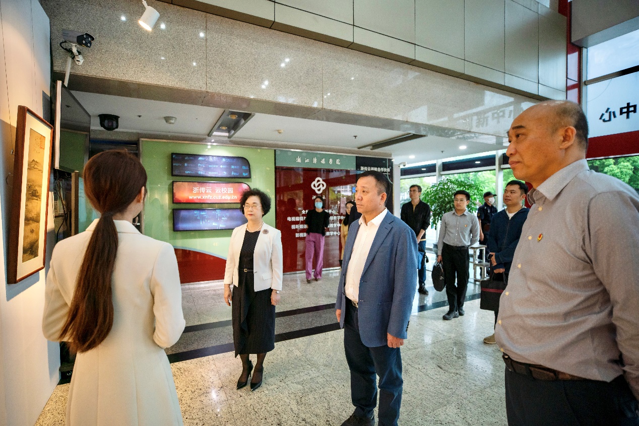 指导组一行还参观了“盛世修典 书香满园——《中国历代绘画大系》浙江传媒学院图书馆馆藏展”。“中国历代绘画大系”是2005年时任浙江省委书记习近平亲自批准,多年来一直高度重视、持续关注,并多次作出重要批示的纵贯历史、横跨中外的国家级重大文化工程,充分彰显了当代共产党人深厚的文化情怀。杨立平向指导组介绍了我校与浙江大学联合共建的“浙江大学中国古代书画研究中心浙江传媒学院分中心”参与“中国历代绘画大系”的研究与编撰情况,以及我校图书馆《中国历代绘画大系》的馆藏情况。