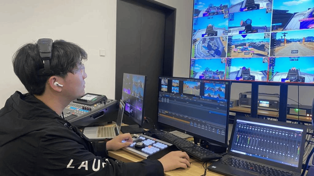 电竞比赛的播出分为两部分,一部分叫做OB视角也称上帝视角,是基于游戏服务器对游戏画面的选择呈现,也是4K电竞综合实验室团队负责的主要内容,包括选手ob、导播、慢放、字幕、推流、POV 操作和调音等。另一部分是对现场过程和选手表现的呈现,这一部分是和传统电视转播紧密关联的,包括定机位摄像、斯坦尼康摄像、摇臂摄像和轨道摄像等。